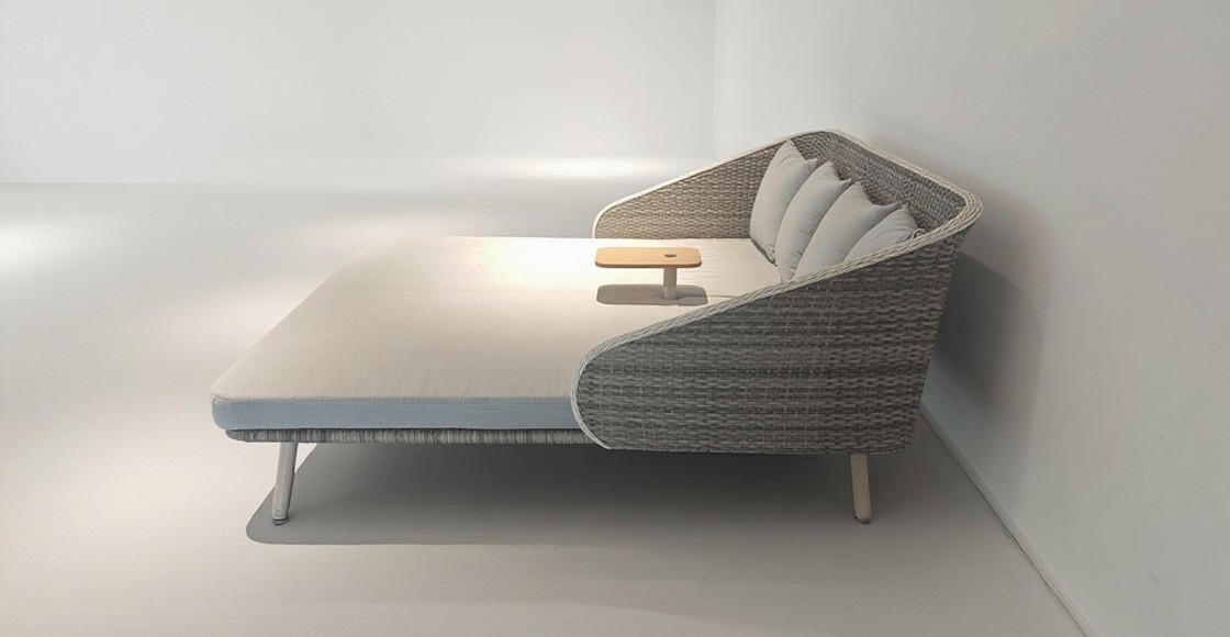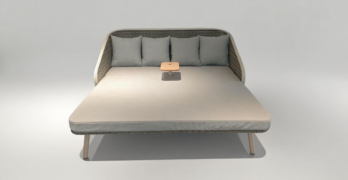 产品描述:铁制编藤躺床:172*187*88cm,坐高29cm,坐、背架编藤,背部及扶手处打三线,藤条:8mm双股半圆藤+圆藤,脚架热转印,带可调节塑木板伞孔平台,配10cm厚坐垫和抱枕式背垫,布面料220克短纤布,表面普通喷塑处理。