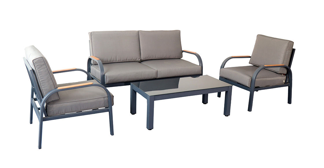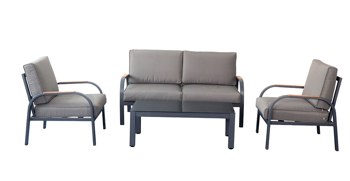 产品描述:铝合金4件套套装:1pc铝玻璃茶几:100*50*36cm,茶几面配厚5mm深灰色丝印玻璃+2pcs单人沙发:70*64*70.5cm+1pc双人沙发:70*140.5*70.5cm,扶手板热印印,配10cm厚坐垫和11cm厚背垫,布面料为短纤布,表面普通喷塑处理。邮购纸箱包装。