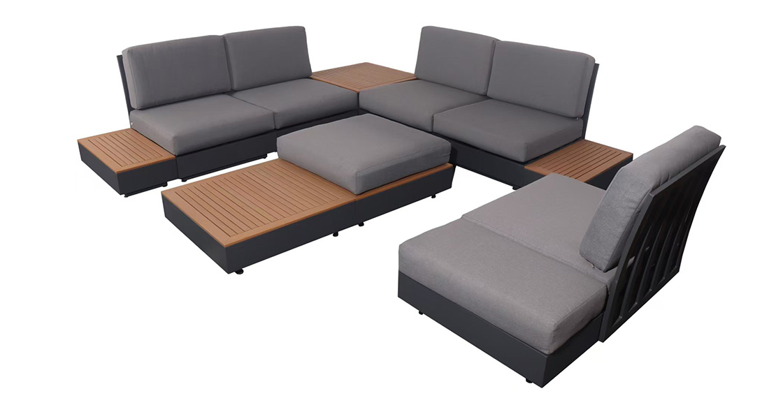 产品描述:铝合金12件套套装:6pcs单人无扶手沙发:80.5*90*78cm,带15cm厚的坐垫和背垫,(12个抱枕)布面料为220克短纤布+2pcs边桌:80.5*40.5*20cm,桌面为仿木板+1pc脚凳:80.5*40.5*20cm,带15cm厚的垫子+1pc转角茶几:80.5*80.5*36cm,茶几面为仿木板+1pc茶几:80.5*80.5*20cm,茶几面为仿木板+1茶几:80.5*80.5*20cm,茶几面为铝条,带15cm厚的垫子,表面普通喷塑处理。